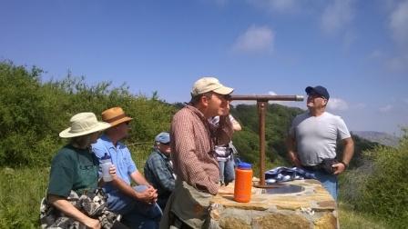 Naturalist Ken Wright offered terrific insight as well. He found a beautiful, healthy gopher snake before lunch for everyone to greet. Later on the optional Sky Island Trail hike, the group enjoyed learning from Ken that the Volcan Mountain Range is home to the relatively-rare bigcone Douglas-fir, discovering that you can wash your hands with ceanothus flowers, and checking on milkweed plants that hold promise to help sustain Monarch Butterflies on their annual migration. The happy hikers journeyed to the recently completed pipe scope designed by James Hubbell and built by metal-artisan, Bill Porter and many volunteers. Although afternoon clouds were beginning to roll in, a few peaks were able to be spotted by the hikers.